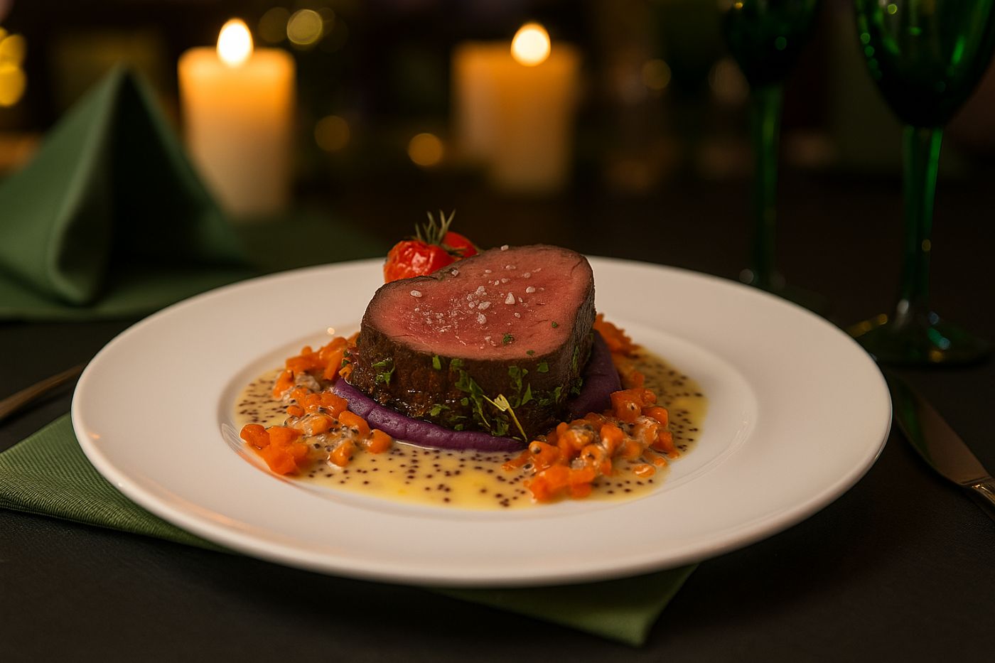 Auch kulinarisch erwartet Ihre Gäste ein Erlebnis für alle Sinne. Käfer hat ein neues 4-Gänge-Menü komponiert, das den Zauber des Waldes auf den Teller bringt: von der Maronen-Orangenschaumsuppe mit Fichtennadeln bis zum Black-Angus-Filet im Blumenkräutermantel. Das süße Finale? Ein Cheesecake auf „schokoliertem Waldboden“ mit Pistazienmoos und Mirabellensorbet – fast zu schön, um ihn zu essen.